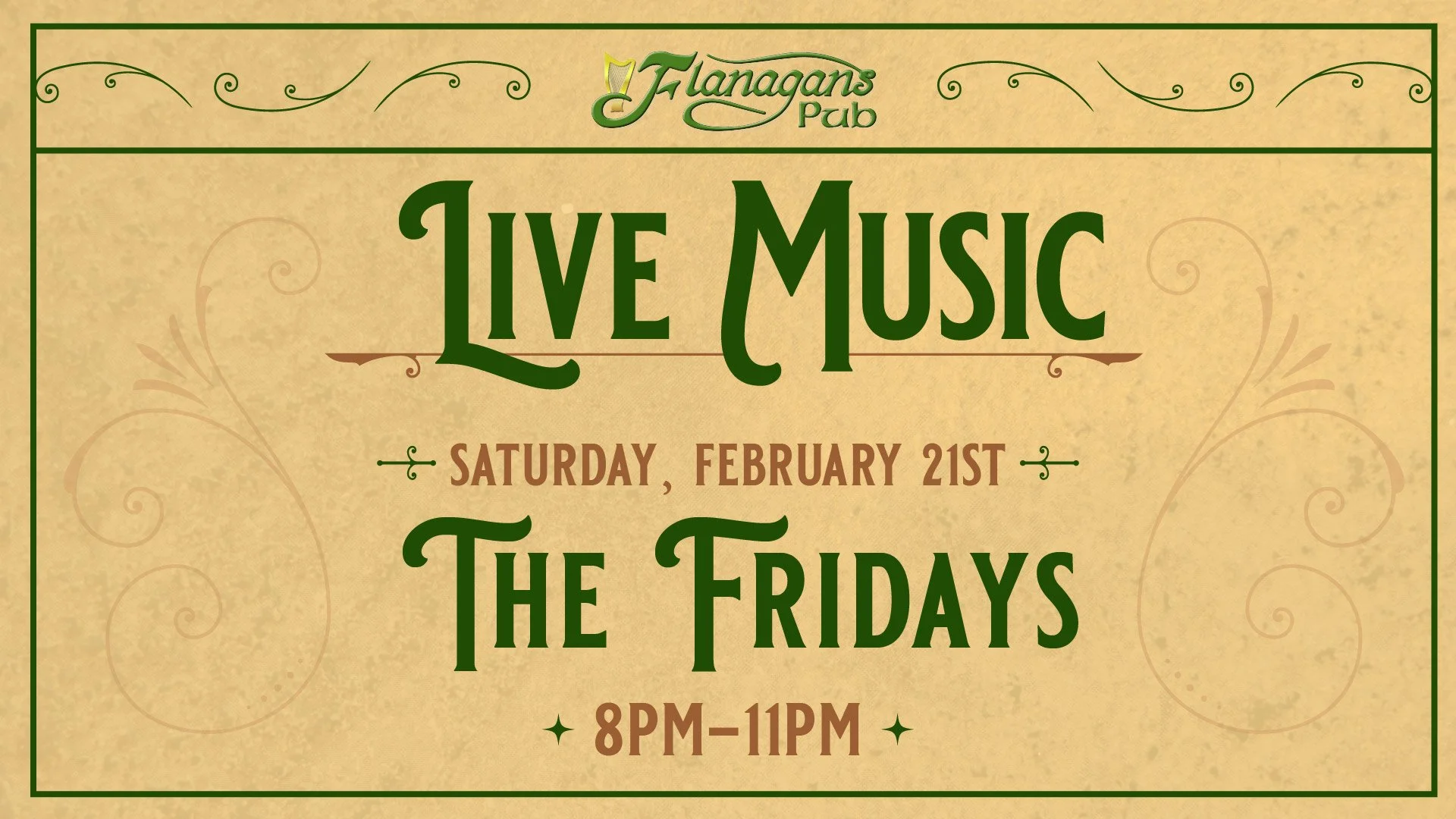 Grab a table and settle in for live music by The Fridays from 8PM–11PM at Flanagan’s Pub.