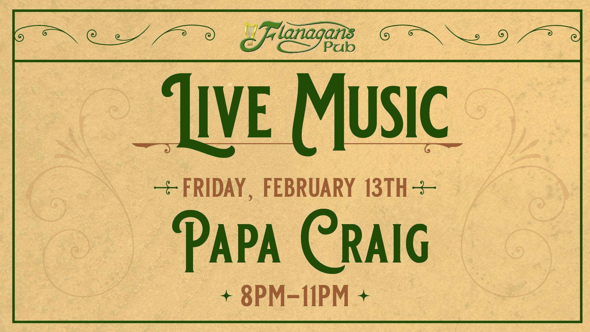 Kick off your Friday night with live music by Papa Craig, 8PM–11PM at Flanagan’s Pub.