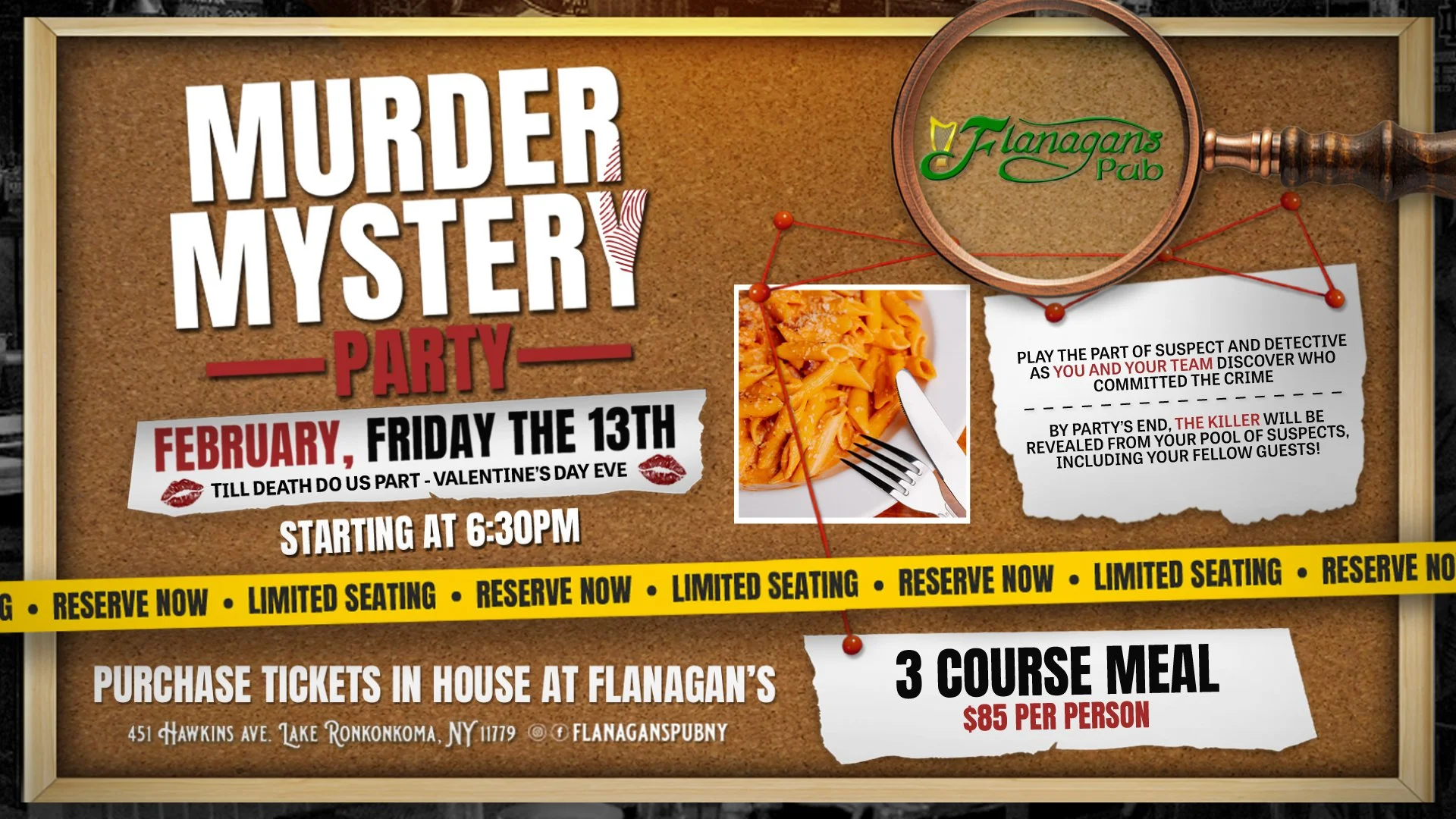 Murder Mystery Party at Flanagan’s on Friday, February 13 (Valentine’s Day Eve) at 6:30pm. Enjoy a 3-course dinner and an interactive mystery where guests play along at their tables. Limited seating — tickets are available in-house at Flanagan’s.