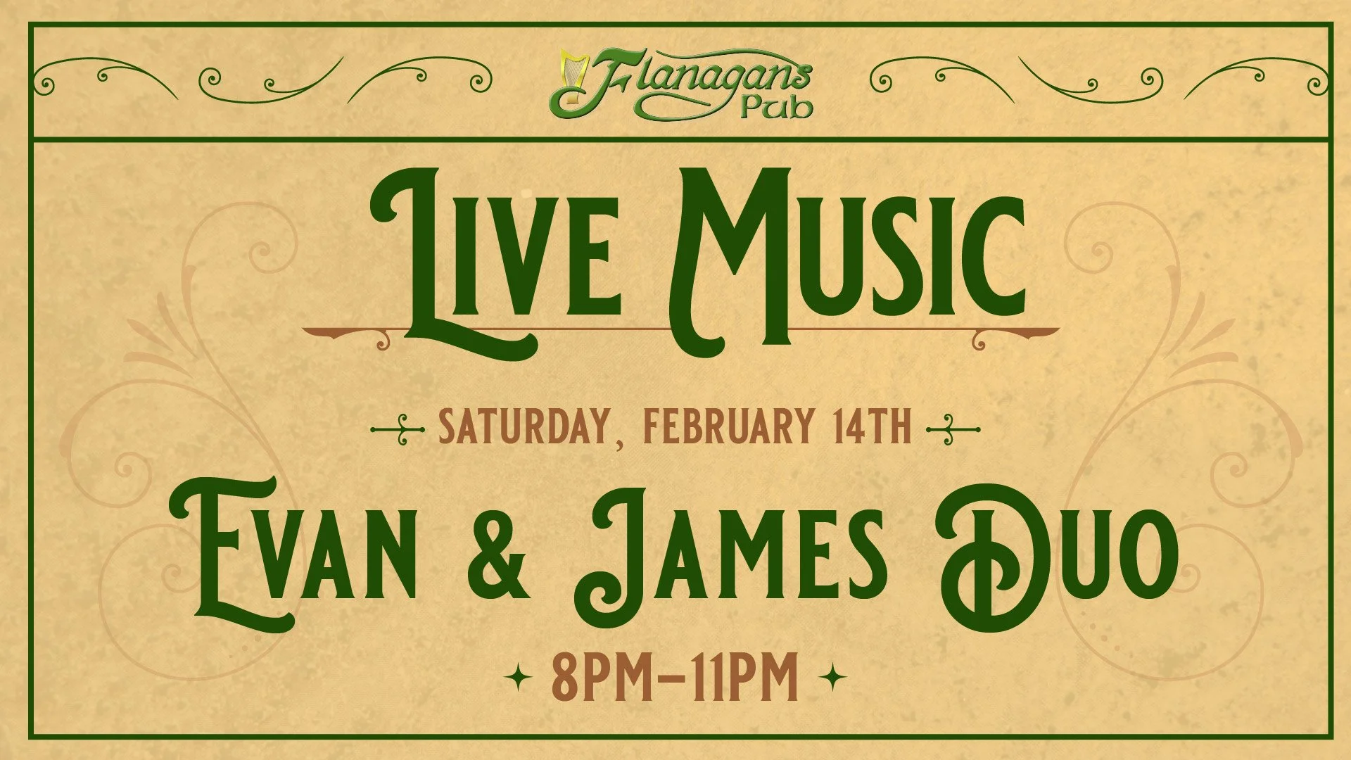 Make it a night out with live music by Evan & James Duo from 8PM–11PM at Flanagan’s Pub.