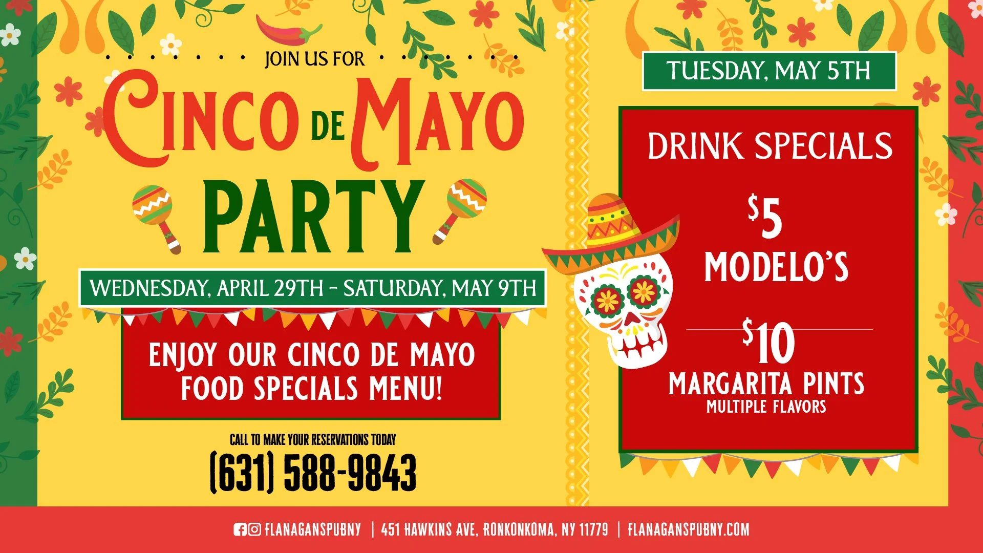 Join us at Flanagan’s for our Cinco de Mayo Party from Wednesday, April 29th through Saturday, May 9th!