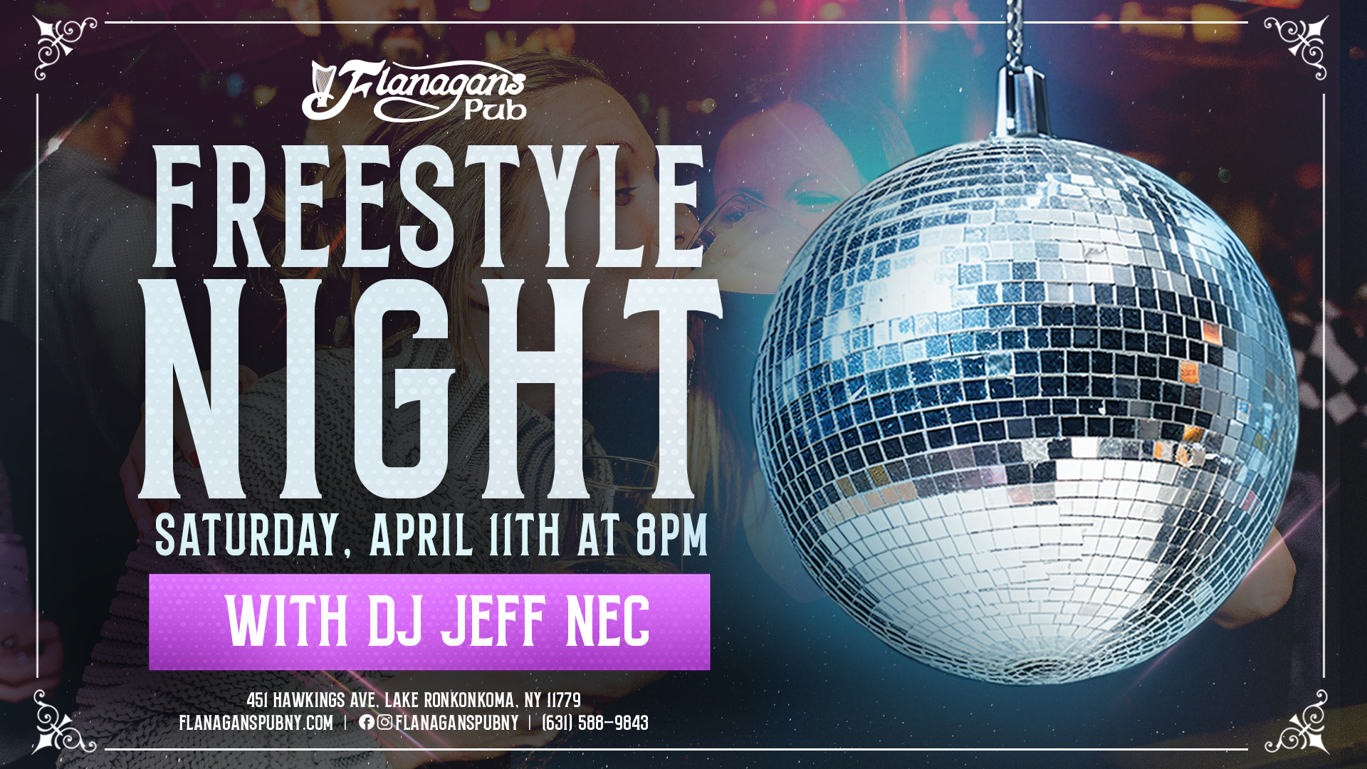 Join us for Freestyle Night at Flanagan’s Pub on Saturday, April 11th starting at 8PM with DJ Jeff Nec!
