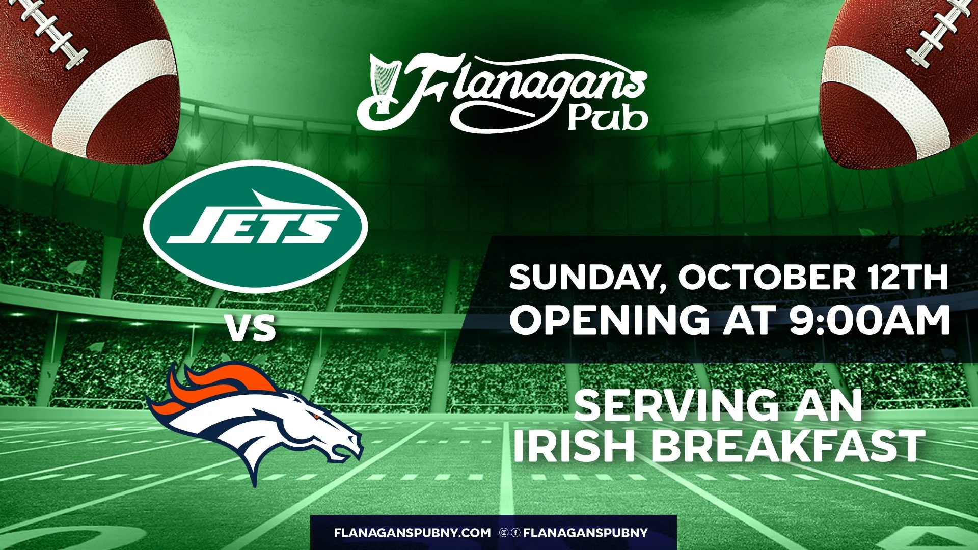 Game Day - Jets vs Broncos Sunday, October 12, 2025 9:00 AM 12:00 PM Google Calendar ICS Game day at Flanagan’s! 🏈 We’re opening at 9:00 AM this Sunday, October 12 for Jets vs Broncos and serving a proper Irish Breakfast to kick things off. Grab a pint, claim your seat, and cheer with the crew. Bring your squad and come hungry!