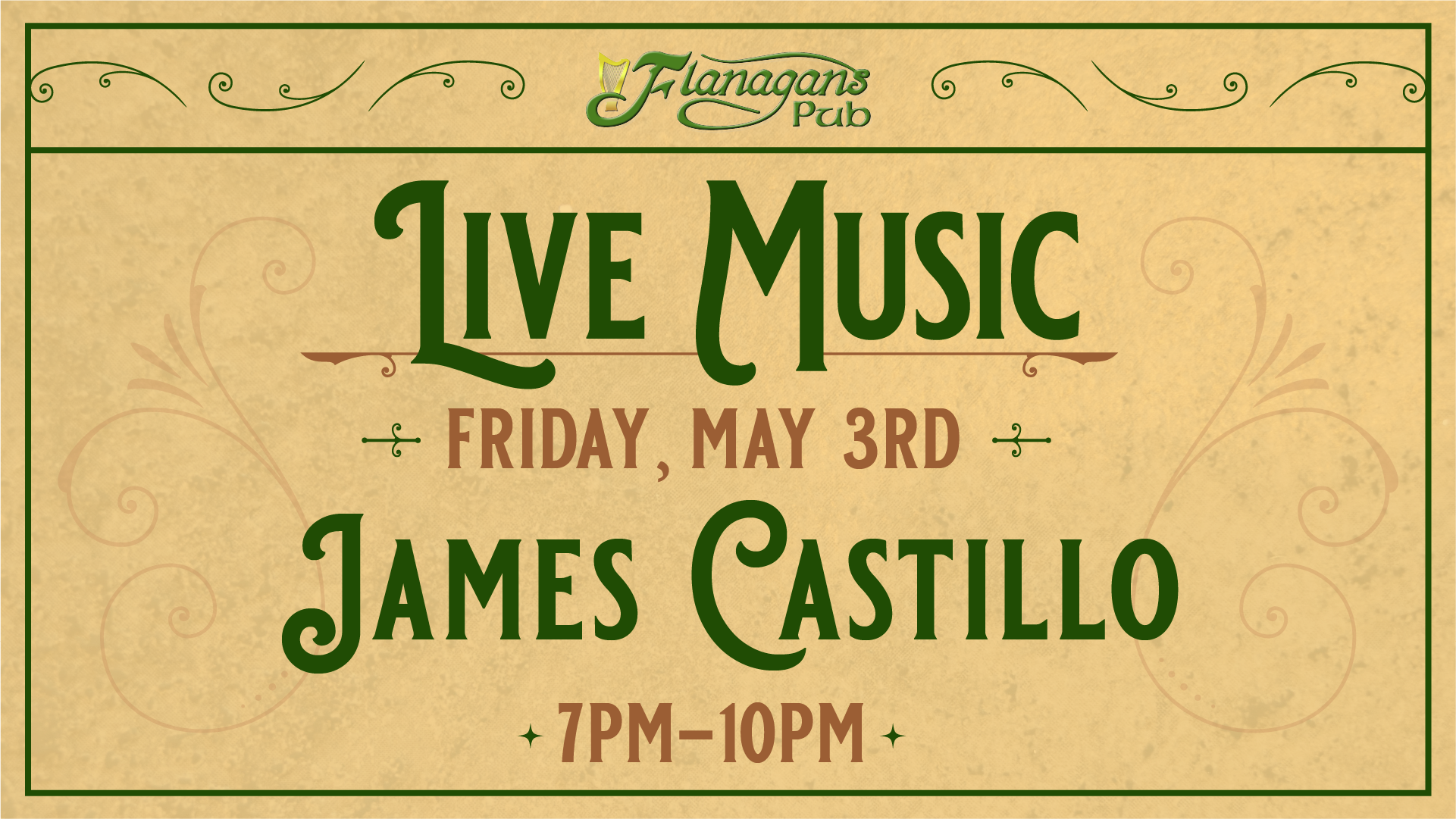 Kick off the weekend at Flanagan's with James Castillo! Swing by at 7 pm for a good time.