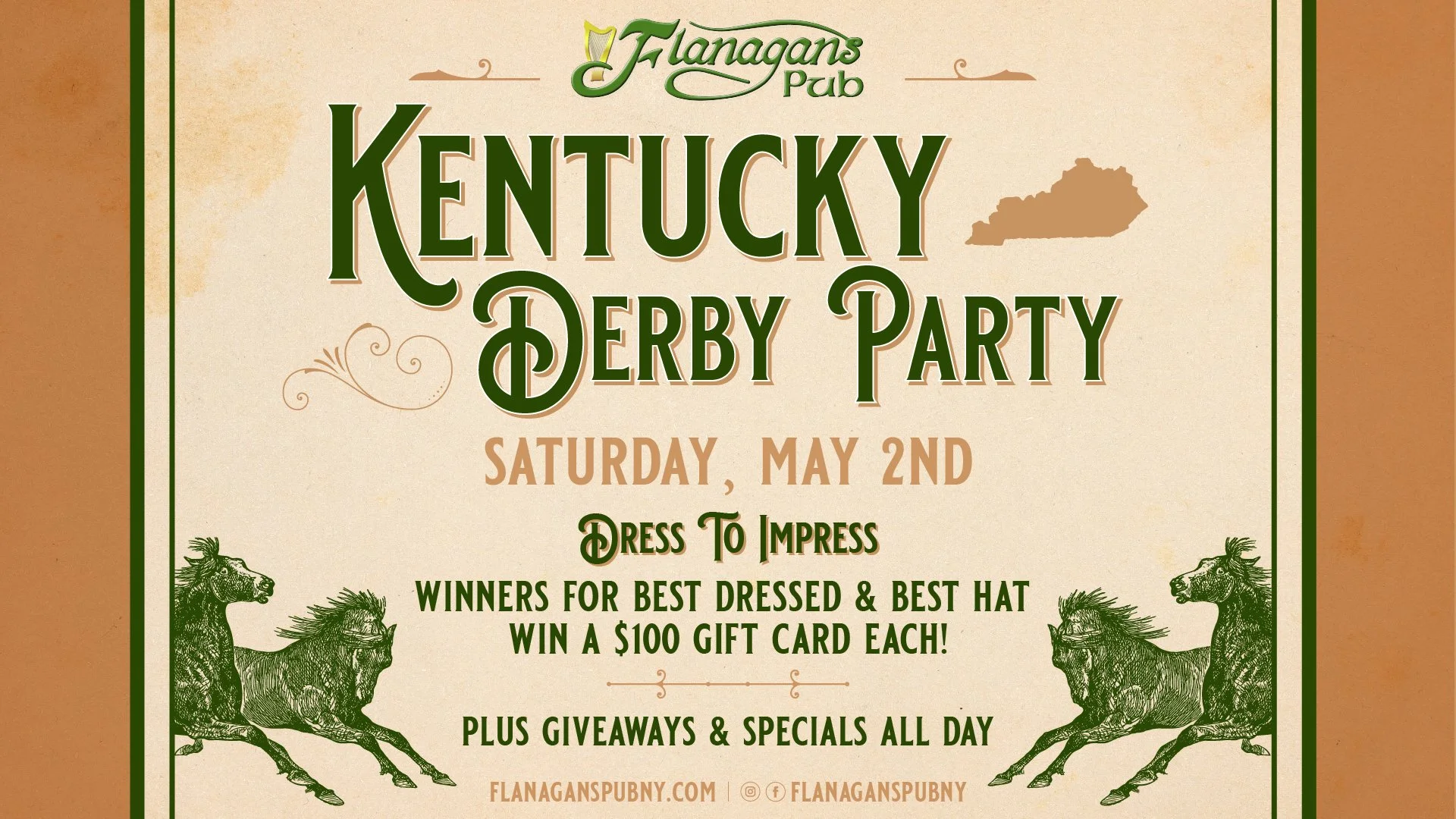 Join us at Flanagan’s Pub on Saturday, May 2nd for our Kentucky Derby Party. Enjoy giveaways and specials all day, plus a chance to win in our Derby Day dress-up contests.