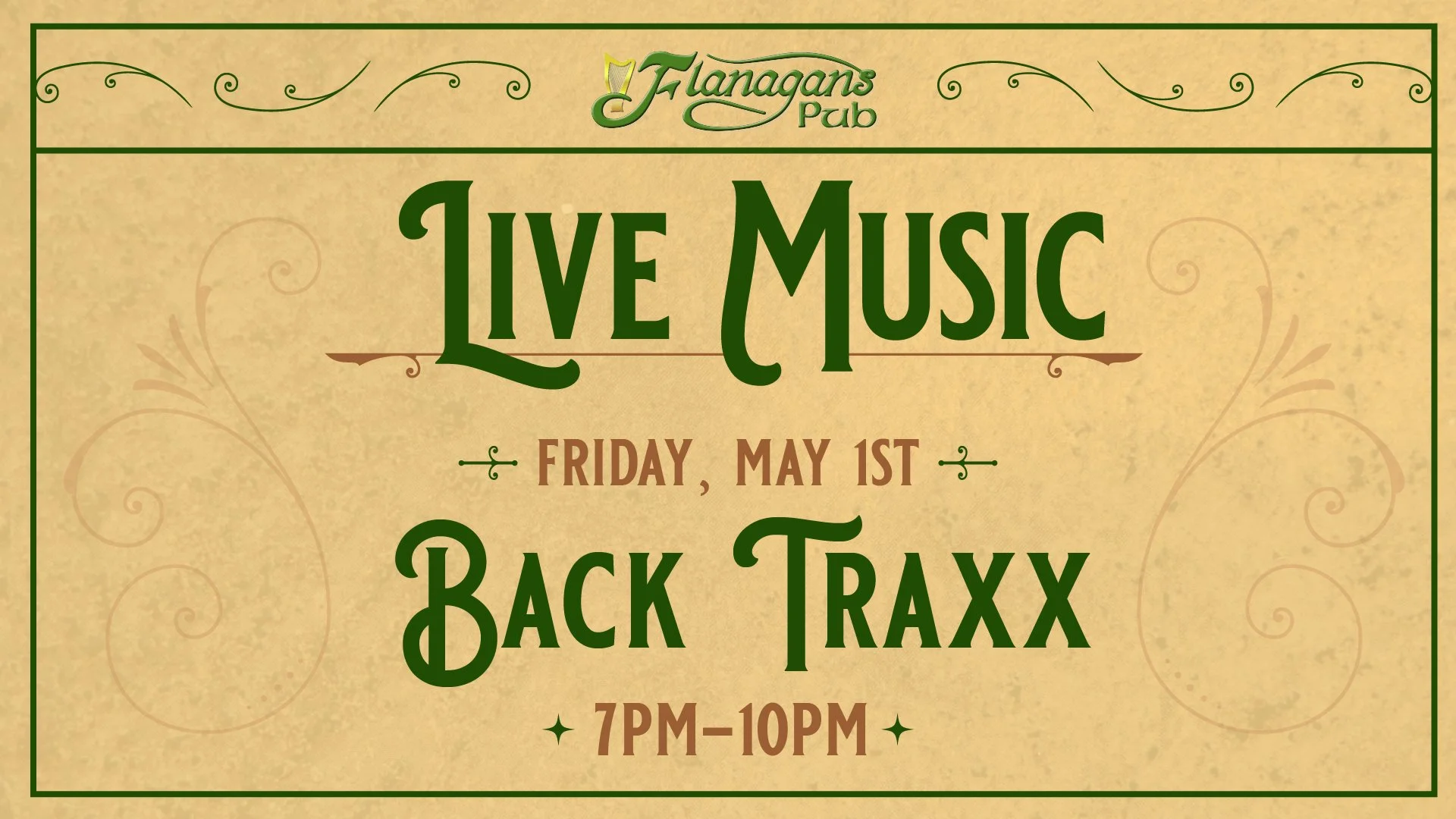 Kick off the month at Flanagan’s Pub with live music from Back Traxx on Friday, May 1st from 7PM to 10PM.