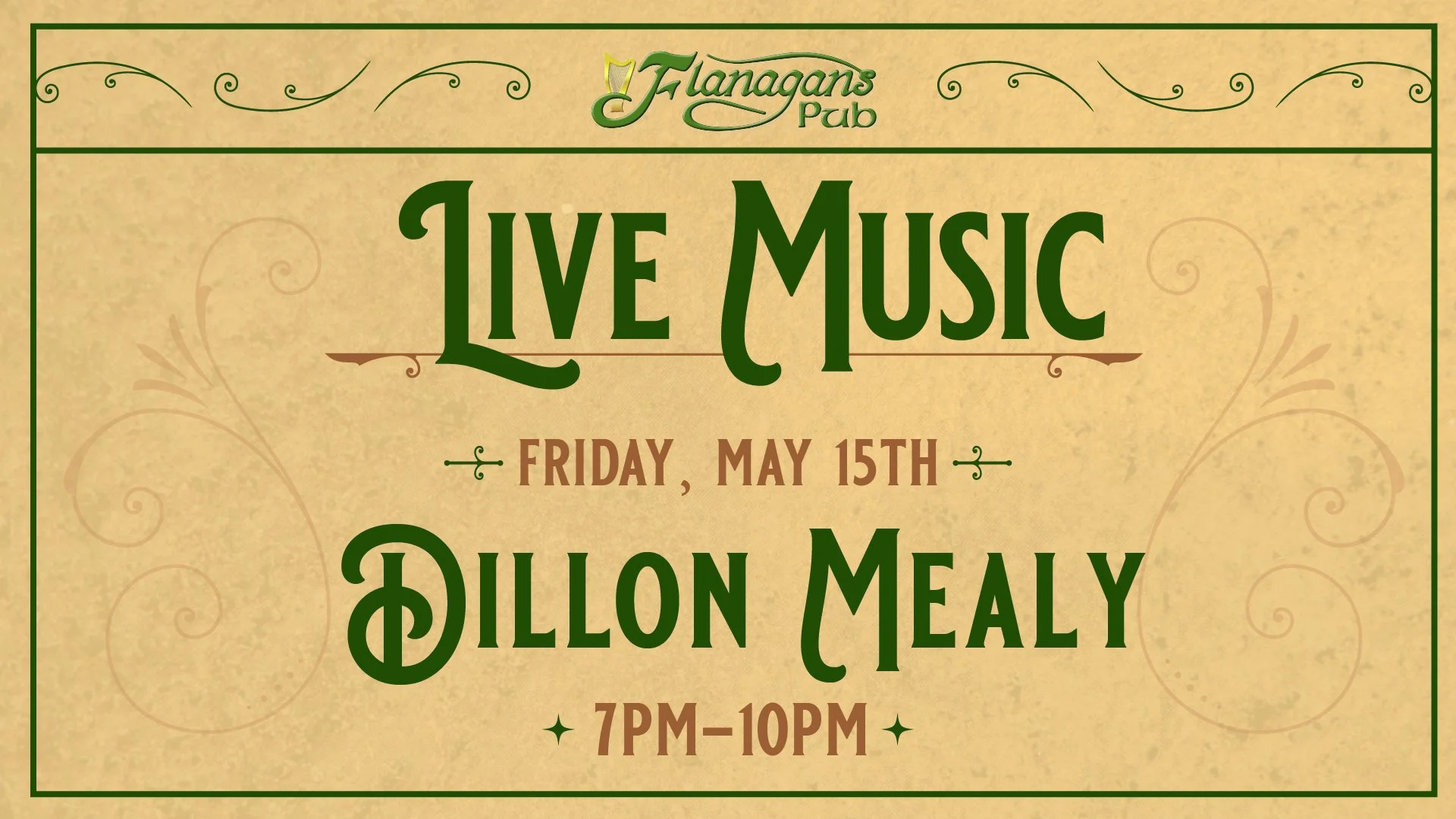 Start the weekend at Flanagan’s with live music from Dillon Mealy. Come by for dinner, drinks, and a Friday night that feels easy.