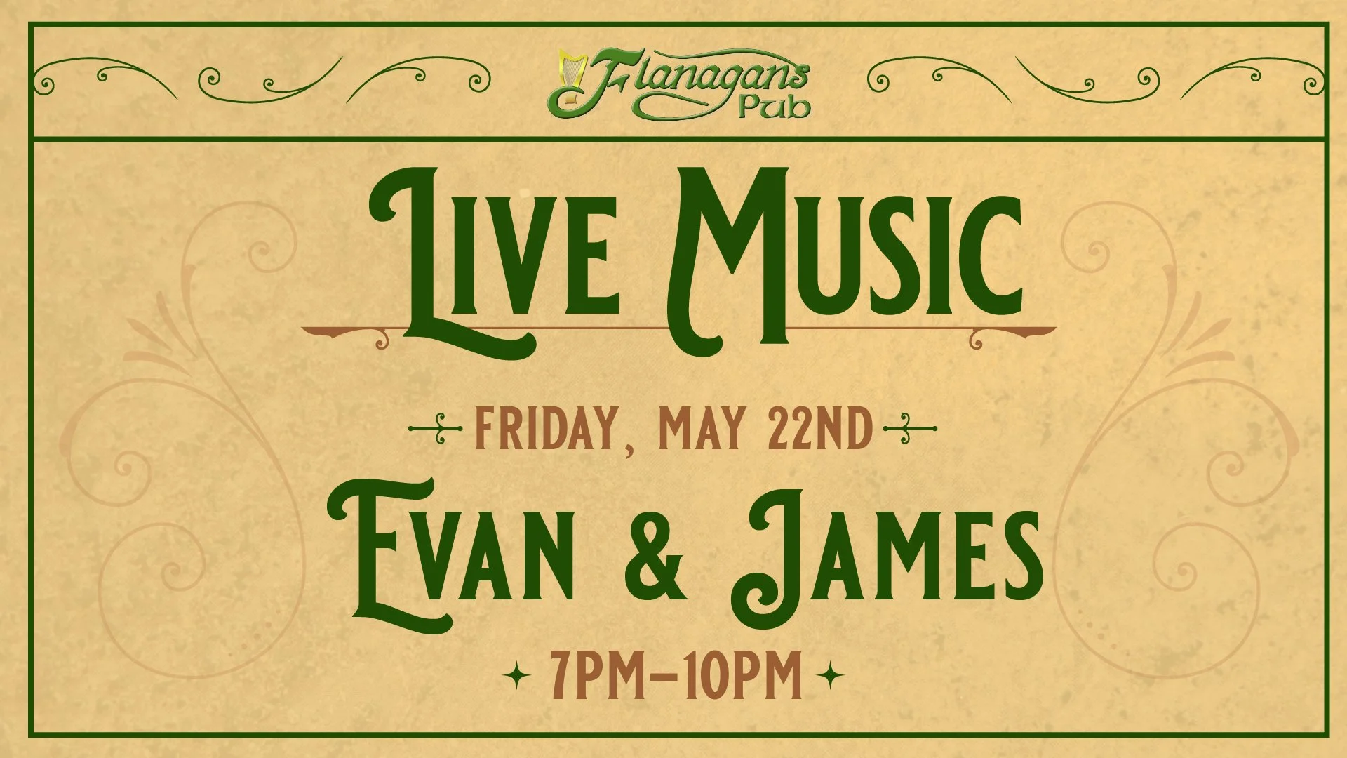 Ease into the weekend with live music from Evan & James at Flanagan’s. Stop by for great drinks, good food, and a laid-back Friday night.
