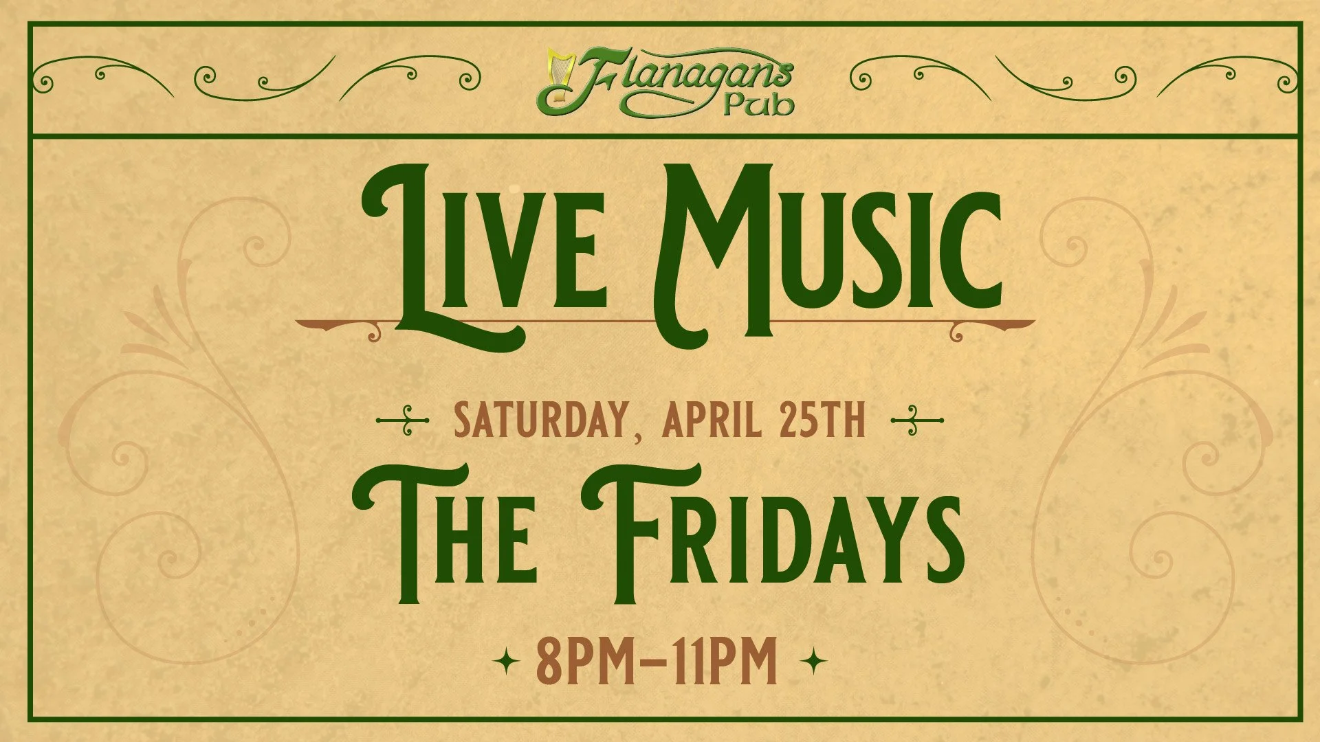 Spend your Saturday night with us as The Fridays take the stage from 8PM–11PM. Join us at Flanagan’s for live music, drinks, and a fun night out.