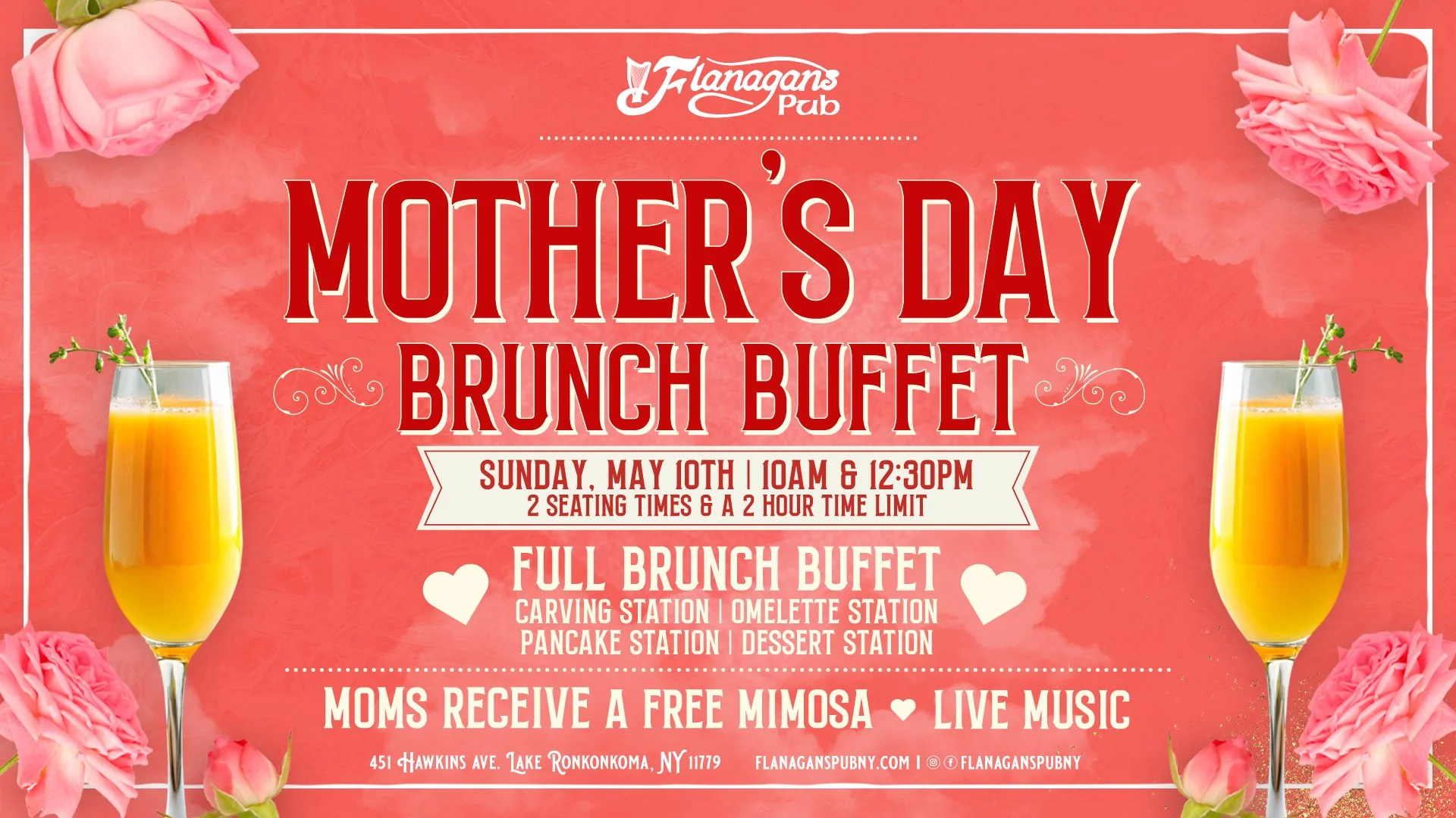 Back to All Events Mother's Day Brunch Buffet Sunday, May 10, 2026 10:00 AM 2:30 PM Google Calendar ICS Join us for a special Mother’s Day Brunch Buffet at Flanagan’s Pub on Sunday, May 10th. Bring the family, enjoy a full brunch buffet, live music, and a complimentary mimosa for moms. Seating times are 10AM and 12:30PM.