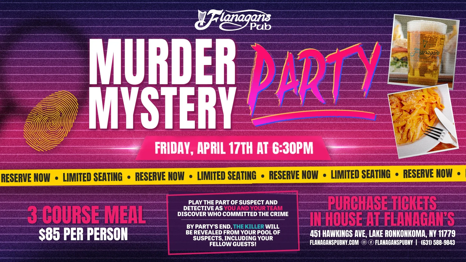 Put your detective skills to the test at Flanagan’s Pub’s Murder Mystery Party on Friday, April 17th at 6:30 PM.