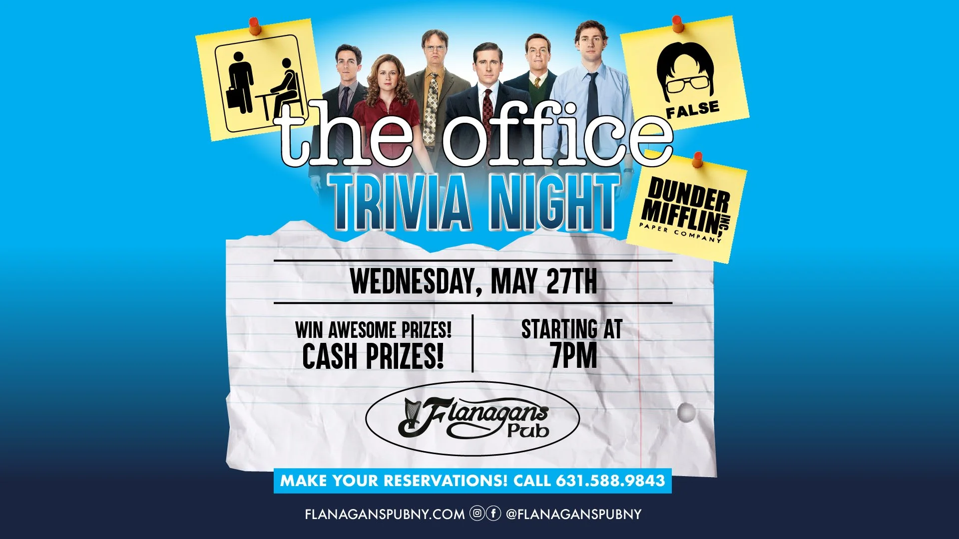Think you know Dunder Mifflin better than anyone? Join us at Flanagan’s Pub for The Office Trivia Night on Wednesday, May 27th starting at 7PM. Gather your team, brush up on your favorite episodes, and get ready for a fun night of laughs, trivia, and awesome prizes.